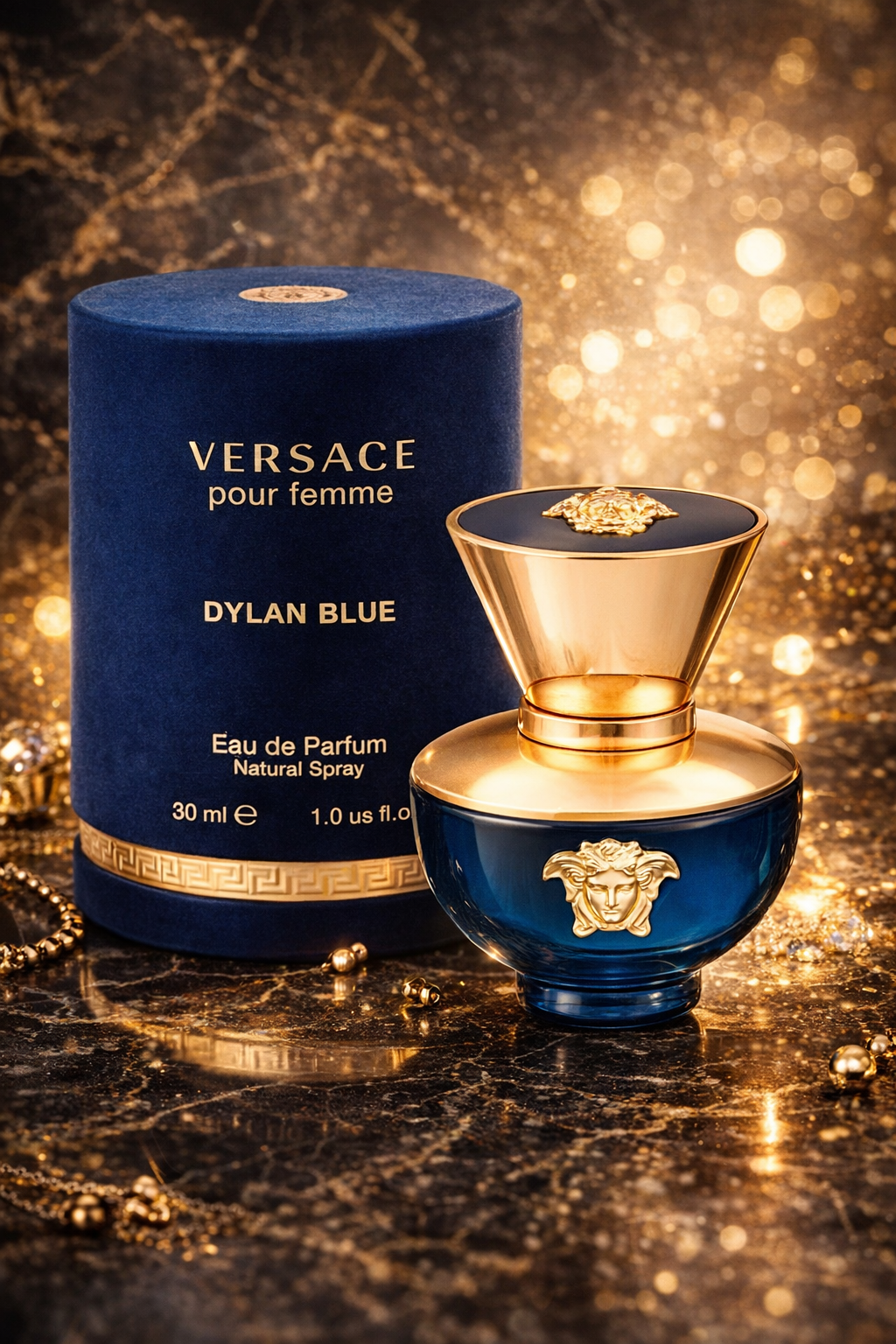Su frasco azul profundo en forma de ánfora, adornado con la icónica Medusa, simboliza carácter, lujo y magnetismo.